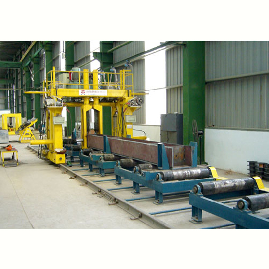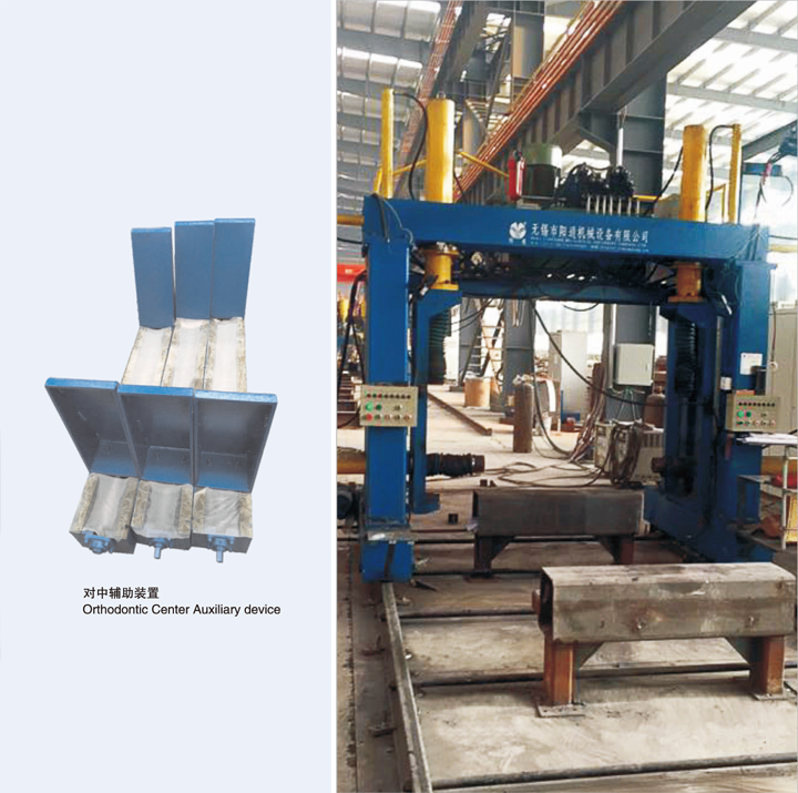 本機用于U型及箱型柱組裝,板材放在帶有輔助對中裝置的支架上,電機驅動行走門架,上、側壓缸壓緊工件的腹板和翼板組裝成型并點焊。