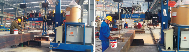 本機(jī)采用垂直電渣焊將內(nèi)隔板與周圍鋼板焊接牢固。有熔嘴式與熔絲式二種電渣焊可供客戶選擇。熔嘴式操作簡(jiǎn)單,投資省,使用成本高;熔絲式操作復(fù)雜,投資大,使用成本低。